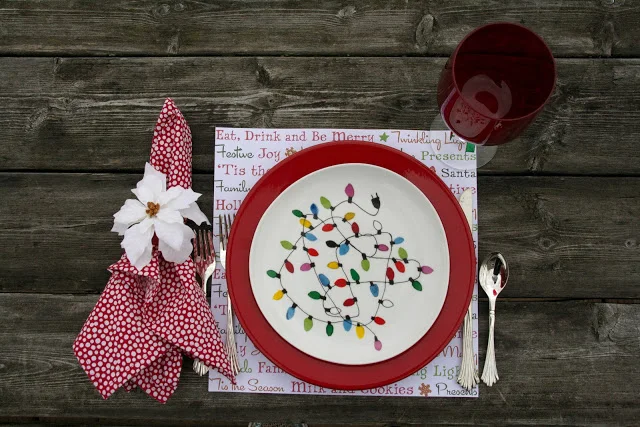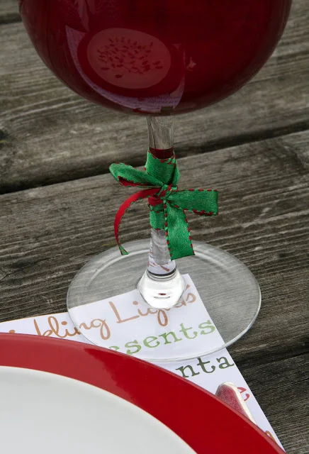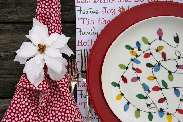 Christmas Light Plate from West Elm, Poinsettia clip from Target, Goblets from Crate and Barrel, Polka Dot Napkin from West Elm and Metal Rectangular Napkin Ring from West Elm.