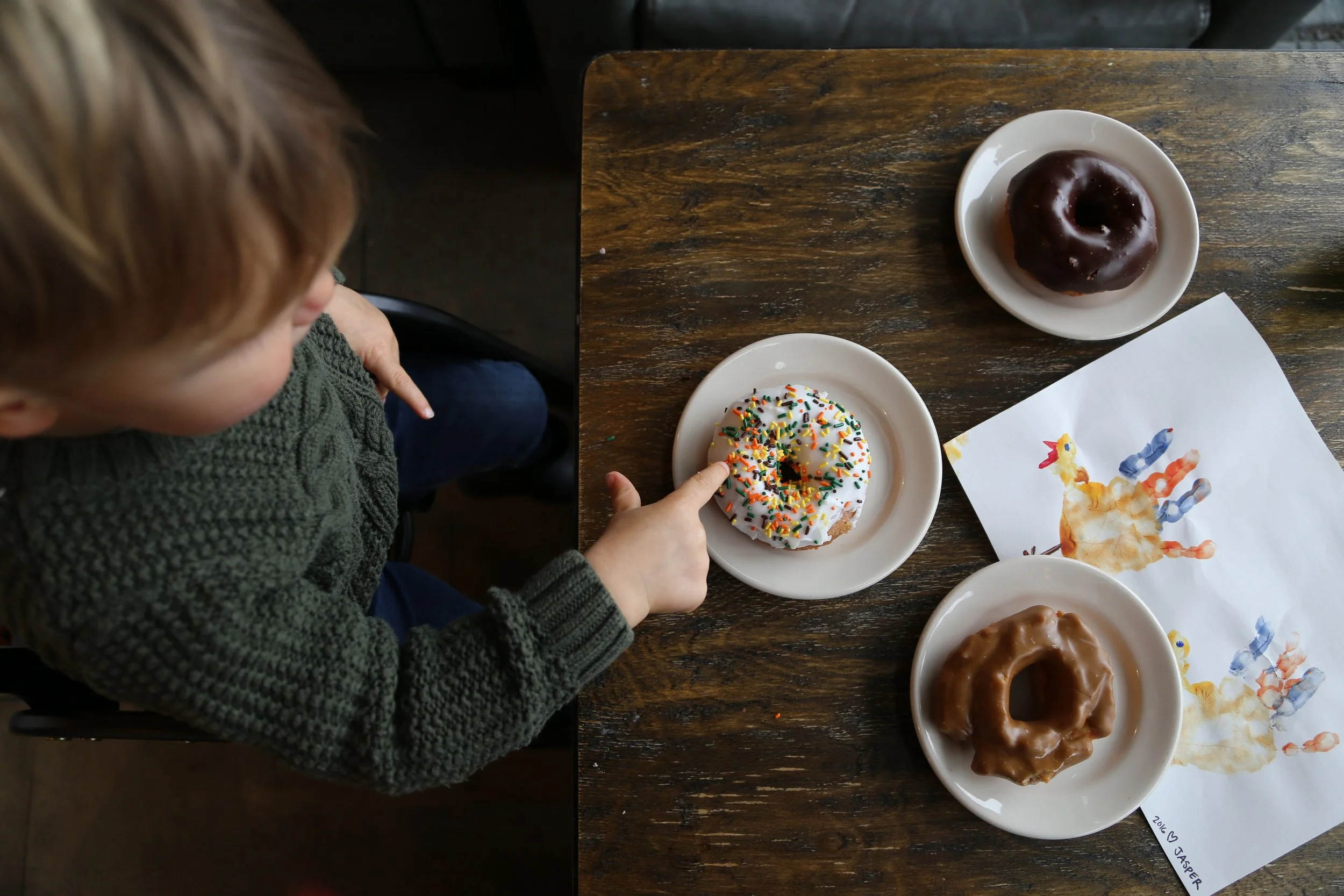 On Thanksgiving, we were a bit under the weather so we paid a visit to Top Pot Doughnut for a little pick me up in the morning. I love watching Jasper's enthusiasm for food. He is forming his own opinions about what he likes and makes it known. He is really taking after his father with his love for pizza and doughnuts.